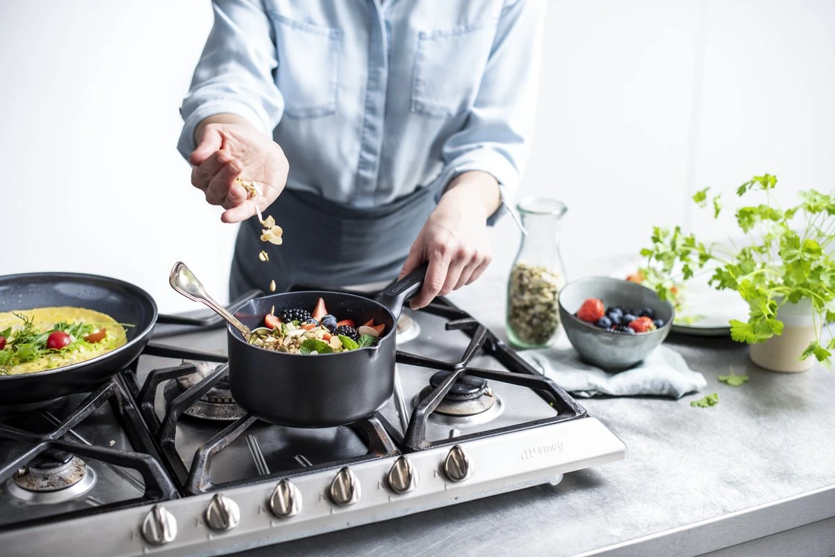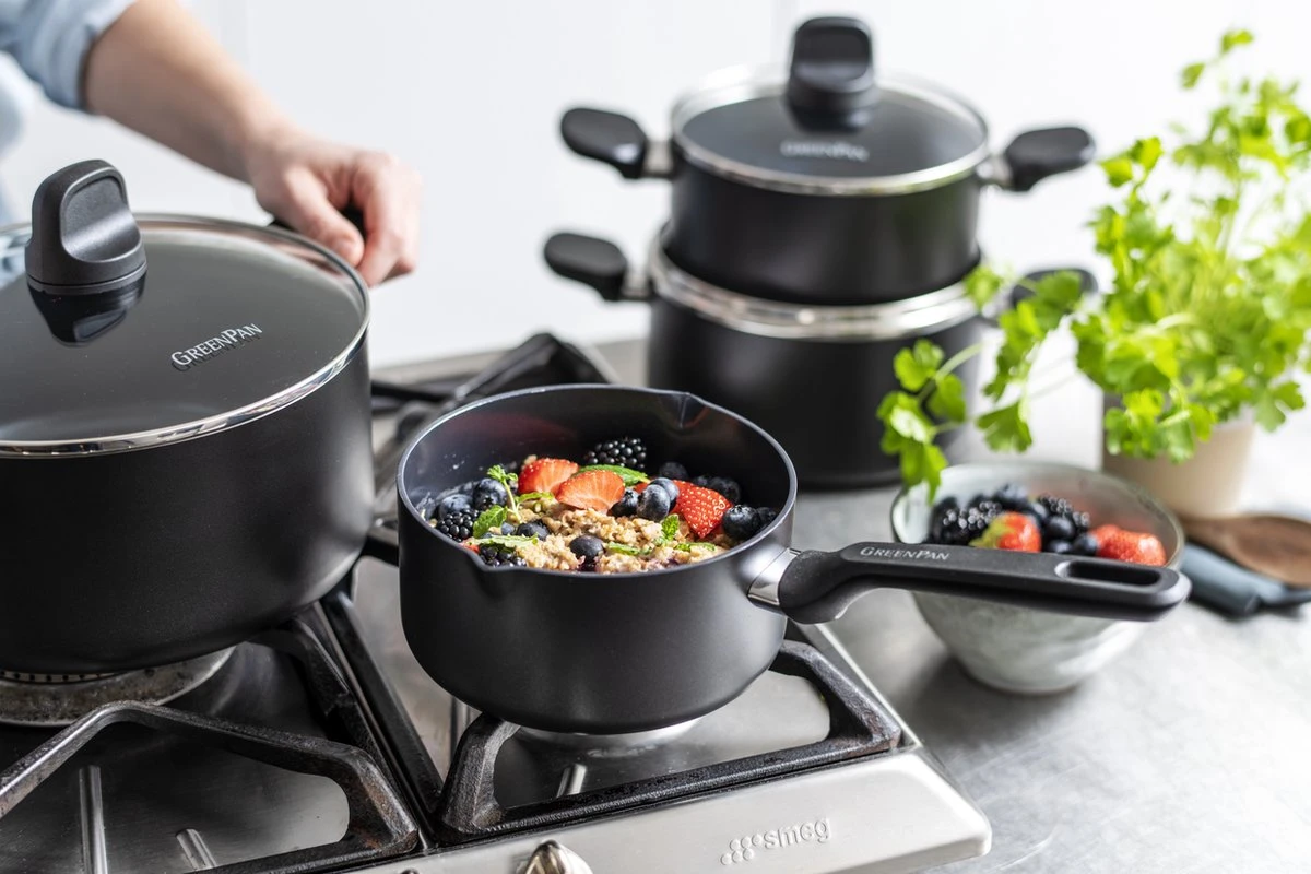 GreenPan is het merk voor iedereen die écht gezond wil koken! Alle potten en pannen hebben een gezonde keramische Thermolon™ antikleeflaag. Die is gemaakt met natuurlijke grondstoffen, zoals zand en bevat géén PFAS. Iets wat de meeste merken van antikleefpannen wél nog steeds doen. Met de keramische antikleeflaag van GreenPan ben je dus zeker dat er geen toxische stoffen kunnen vrijkomen, zelfs als je graag kookt op hoge temperaturen.