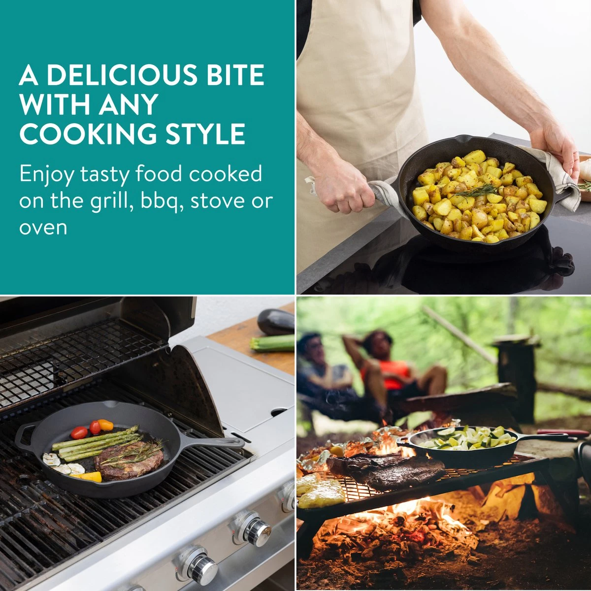 - VEELZIJDIGE PAN: De gietijzeren koekenpan van Navaris is ontzettend veelzijdig. Vlees braden, pannenkoeken bakken, een stoofschotel bereiden of pizza maken – het kan allemaal in deze pan van gietijzer.