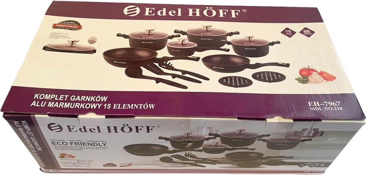 Pannenset 15-delig met marmeren coating. Pannen zonder giftige stoffen, gemakkelijk schoon te maken en geschikt voor alle warmtebronnen. De pannen zijn vervaardigd van hoogwaardig aluminium en de deksels zijn voorzien van een gaatje voor stoomafvoer.