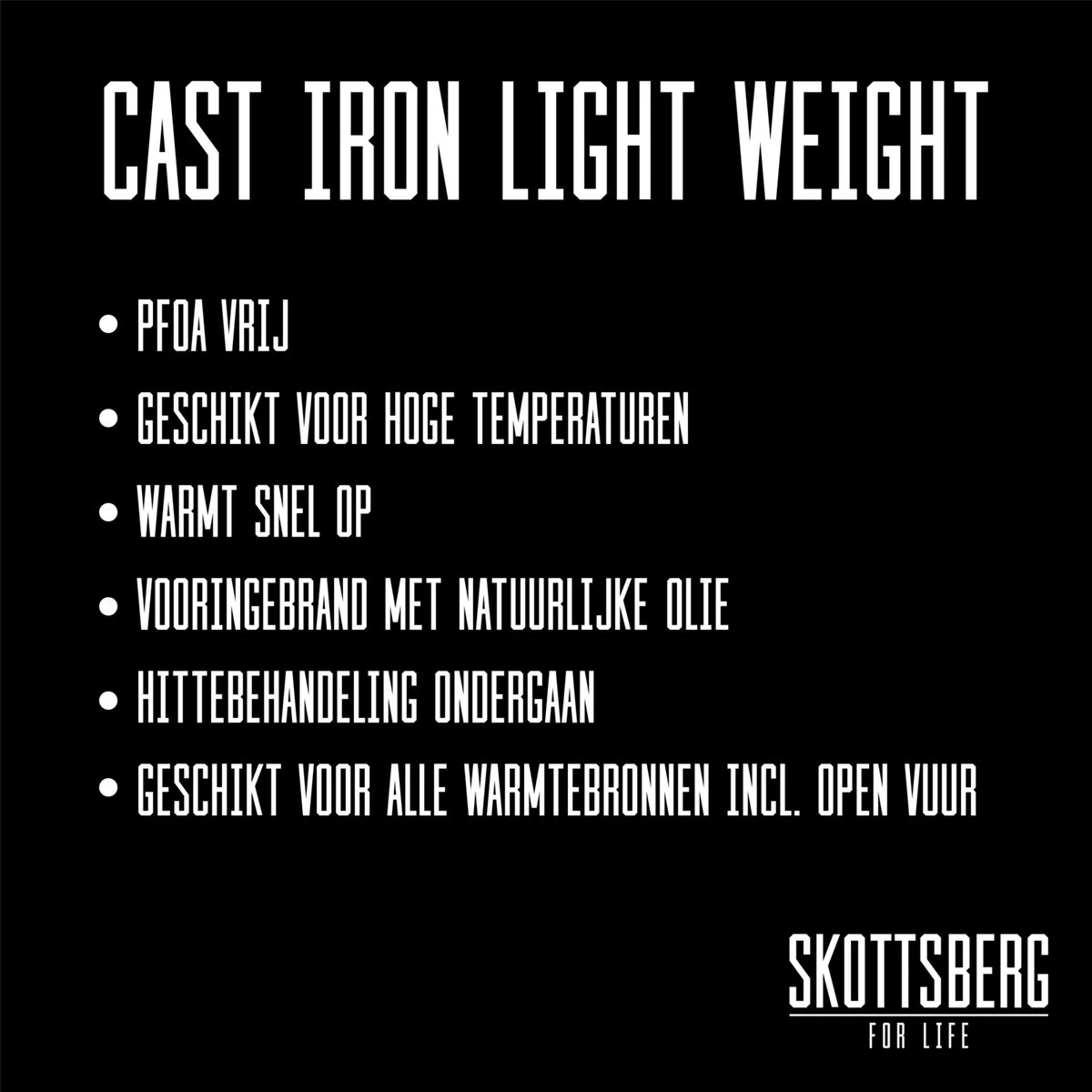 Deze SKOTTSBERG® Cast Iron koekenpan wordt gewaardeerd om een aantal bijzondere eigenschappen. De pan is pre-seasoned, dat wil zeggen dat de pan is ingebrand met plantaardige olie, waardoor je de pan direct na aankoop kunt gebruiken. Het is nóg beter om zelf de pan opnieuw in te branden. Deze koekenpan is gemaakt uit één stuk gegoten lichtgewicht slijtvast gietijzer. De koekenpan warmt snel op, het is dus erg belangrijk dat je de koekenpan langzaam laat opwarmen om te voorkomen dat de bodem van de pan krom trekt. Het heft van deze koekenpan is hol, waardoor deze niet warm wordt en goed vast te pakken is.